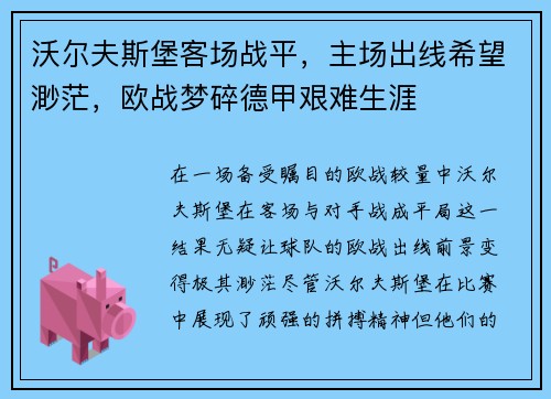 沃尔夫斯堡客场战平,主场出线希望渺茫,欧战梦碎德甲艰难生涯