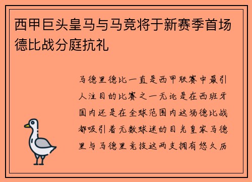 西甲巨头皇马与马竞将于新赛季首场德比战分庭抗礼