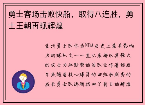 勇士客场击败快船,取得八连胜,勇士王朝再现辉煌